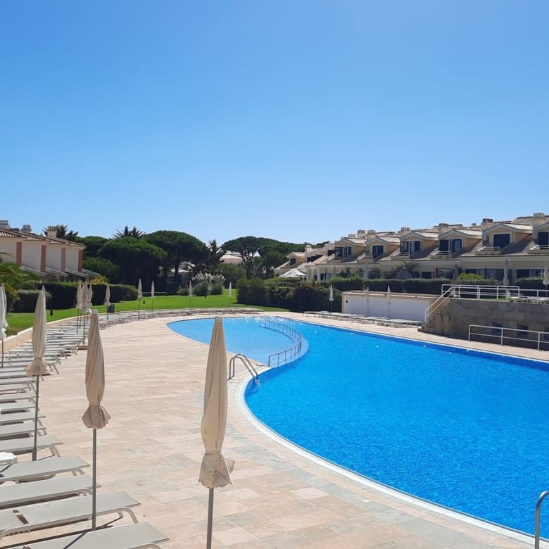 O empreendimento conta com duas piscinas exteriores, rodeadas por áreas verdes e bem cuidadas.